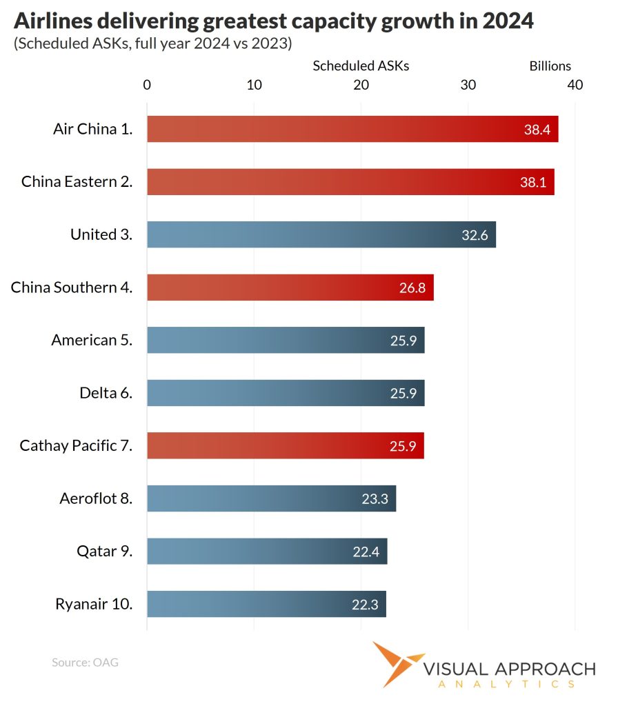 Four of the top ten airlines adding capacity in 2024 are based in China. Granted, much of the country’s airline growth is due more to a low base in 2023, but it shows just how critical China has been in the global context last year.