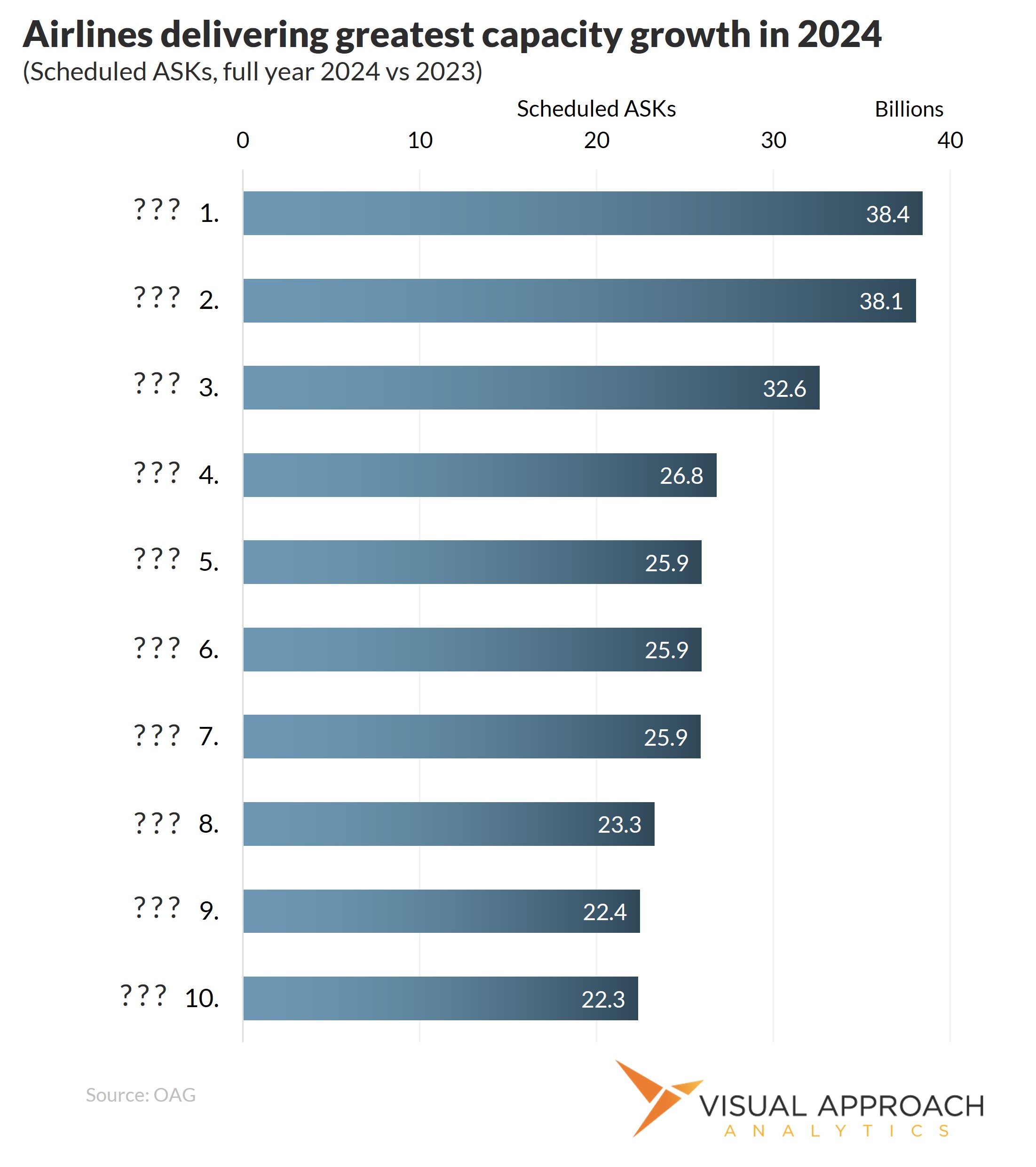 Which airlines added the most new capacity to the global system in 2024 compared to 2023? Since we’re looking for total ASK growth, the airlines will all be rather large.