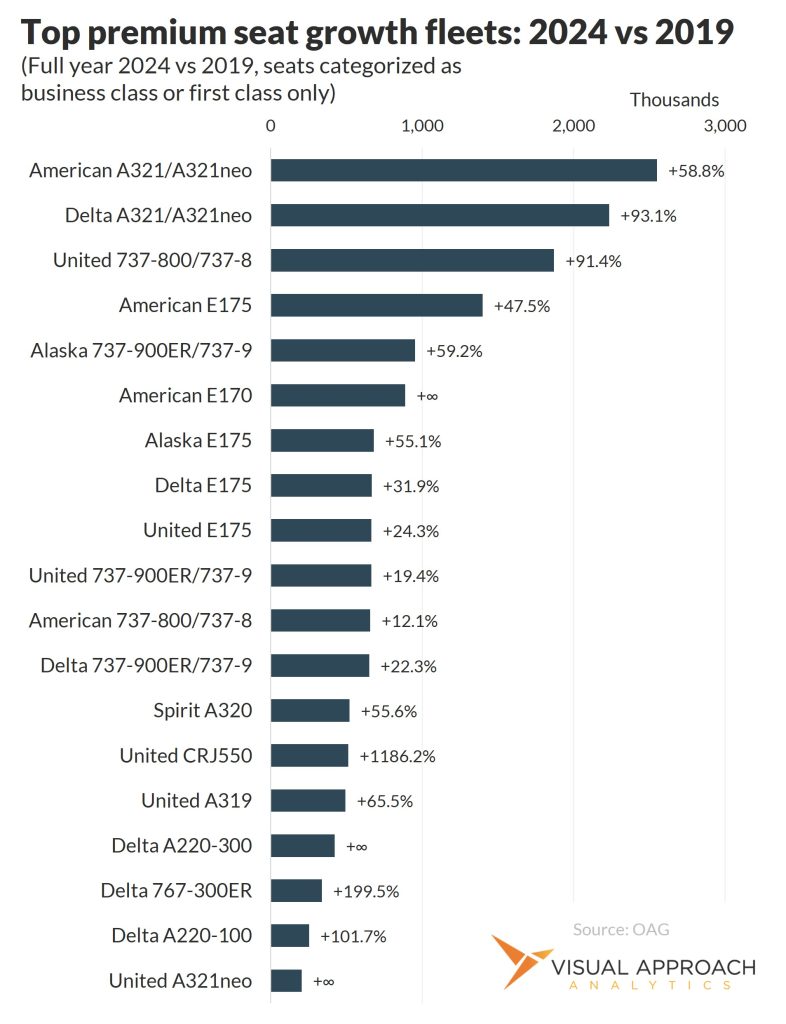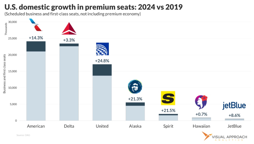 On a percentage basis, United Airlines has seen the largest growth. But United is growing from a relatively low base. The largest growth in overall domestic first and business class seats is American Airlines.