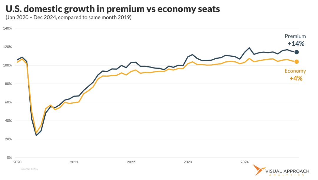 Since 2019, the number of scheduled economy seats in the domestic U.S. market has grown by 4%. Scheduled premium seats have increased by 14%—over three times the amount.